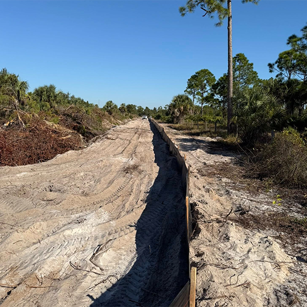Land clearing, grading, silt fence installation, conduit trenching, driveways, pads, and site prep - done right the first time.